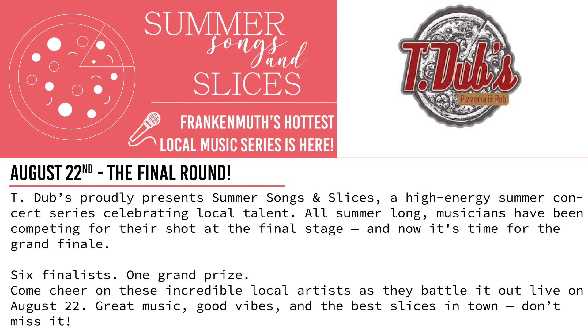 Whether you're a local music lover or just looking for a great night out, this is the place to be. Bring your friends, grab a slice, and help us celebrate the best of Frankenmuth’s local music scene.